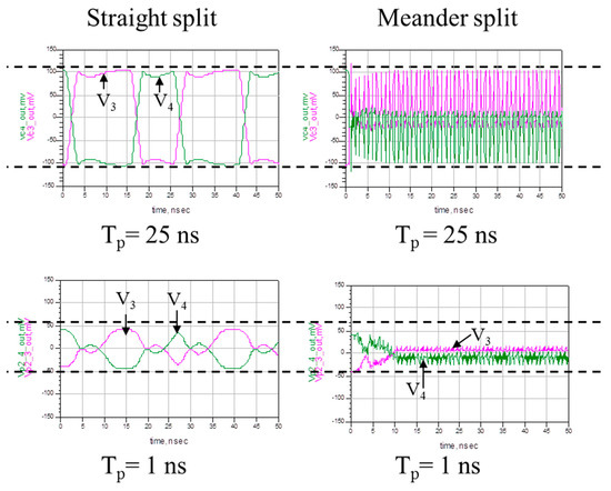 The crosstalk behavior of the transmission line equivalent circuit model for the meander DGS split is simulated in the time domain by using Agilent ADS in Figure 10. We excited a source pulse voltage 1Vp-p with 50 ohm and checked the voltage of V3 (port #3) and V4 (port #4). Figure 11 shows when the fast pulse signal is excited, the proposed meander DGS split decreases the crosstalk voltage at port #3 and #4 over 50% more than the straight split.