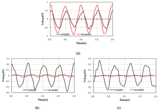 Comparison of the transmission and crosstalk signal with the straight and meander split power or ground plane. (a) Transmission signal measured at port #2; (b) near-end crosstalk signal measured at port #3; (c) far-end crosstalk signal measured at port #4.