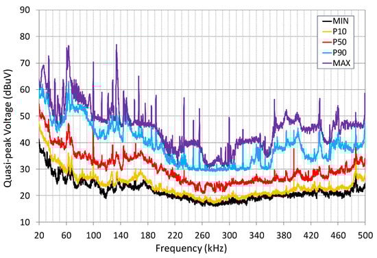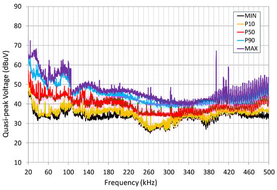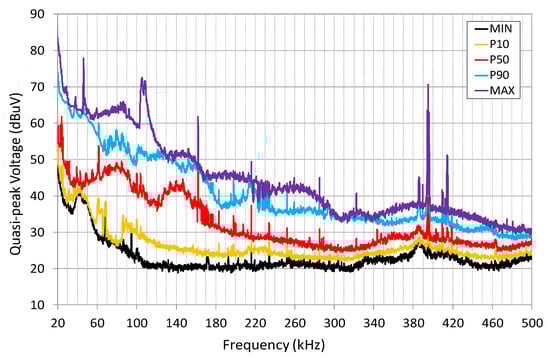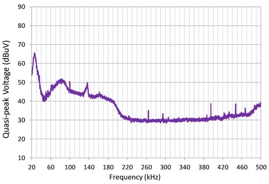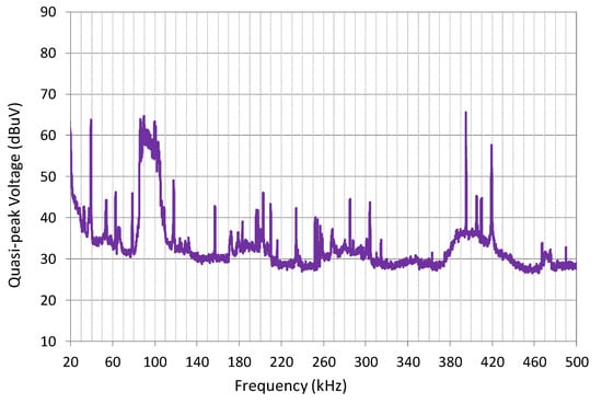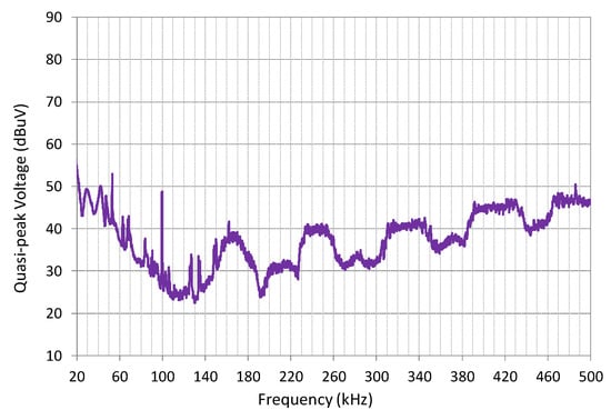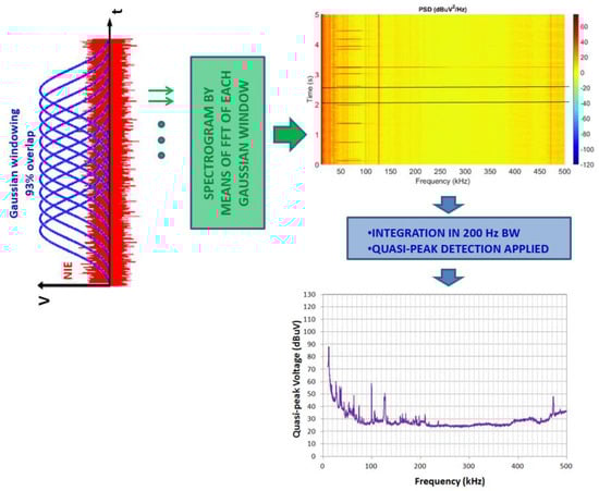 The measurement recordings are then post–processed to obtain the NIE values in time and frequency domains, by applying the CISPR specifications defined for narrowband signals up to 150 kHz [44,45,46]. The data processing described in the CISPR documents is applied for the whole frequency range (20 kHz to 500 kHz).