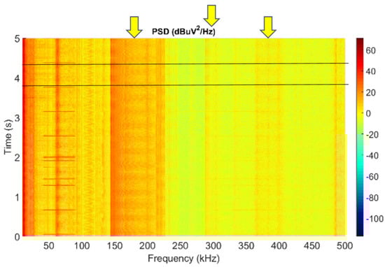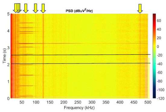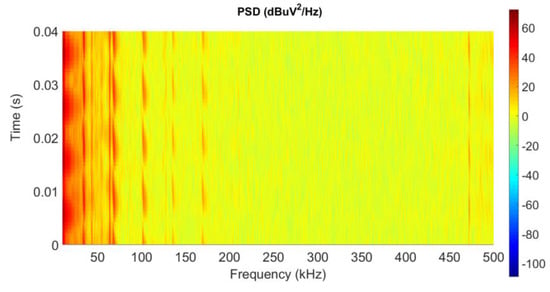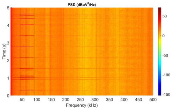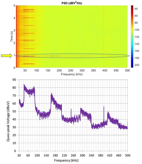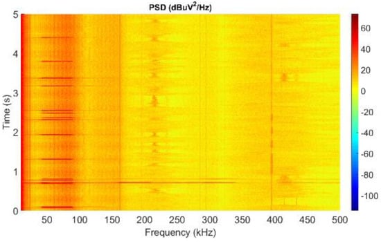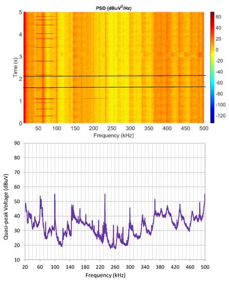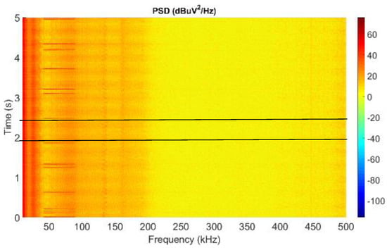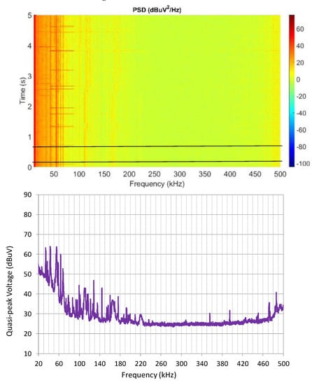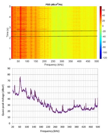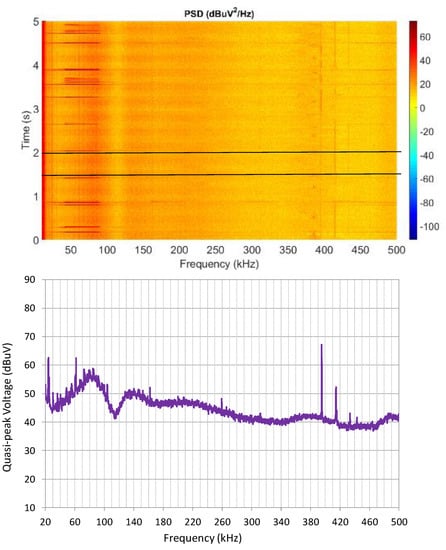 In the trials, measurement intervals of 5 s were recorded, in order to characterize the time-variability of the emissions but the measuring time to be introduced in the designed software was selected in order to be free of NB-PLC transmissions, in order to avoid that the communication signals distort the results and to ensure that only non-intentional emissions were considered [4,43]. These NB-PLC transmissions can easily be detected in the spectrograms. For example, all the horizontal red-lines between 42 kHz and 89 KHz in the spectrogram of Figure 2 correspond to PRIME v1.3.6 signal bursts and the selected measuring time for this example would be the one between the black horizontal lines in the spectrogram.
