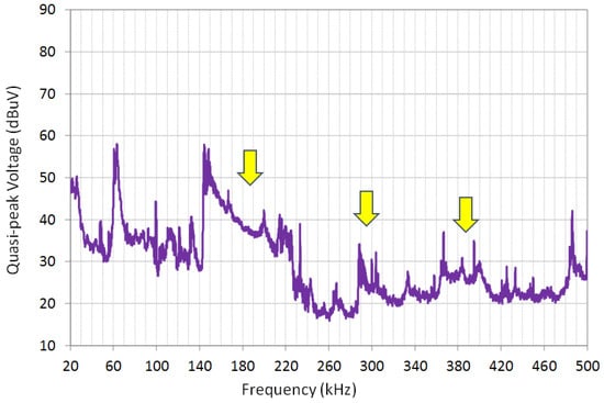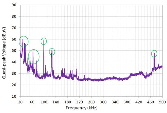 Examples of wide band NIE are also reported in [53,54], where there is a component slightly above 40 kHz that disappears when the light is turned off at a shopping mall. Bursts of wide band NIE were also registered in measurements published in [26]. In [55], rather, broadband spectrums from 2 kHz to 150 kHz are obtained for light-emitting diode (LED) street lamps using active power factor correction and high-pressure sodium lamps with electronic ballasts. In [7], measurements of two EV chargers in laboratory conditions showed wide-band disturbances between 9 kHz and 65 kHz and between 9 kHz and 100 kHz, respectively.
