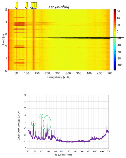- The quasi-peak amplitude of NIE, according to the CISPR 16 assessment methodology (see Section 4.1), provides a clear representation of the spectral shape and the relevance of different types of NIE. In order to avoid NB-PLC signals in the data processing, the quasi-peak amplitude of NIE is calculated for a time interval of 0.5 s (the time interval selected for this type of graph is indicated in the corresponding spectrogram by means of two black lines, as shown in Figure 3).