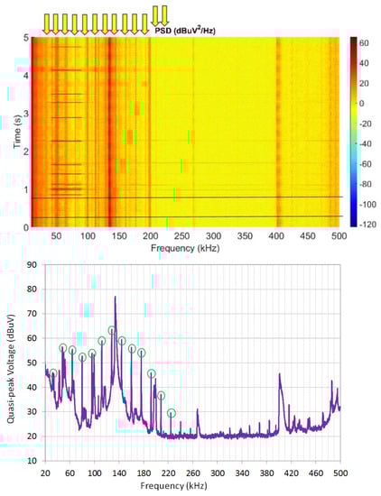 Spectrogram (top) and spectral characterization of NIE according to CISPR 16 (bottom) of a measurement point containing NIE in the form of tonal emissions (some of them are marked with yellow arrows in the spectrogram and with green circles in the CISPR-16 graph).