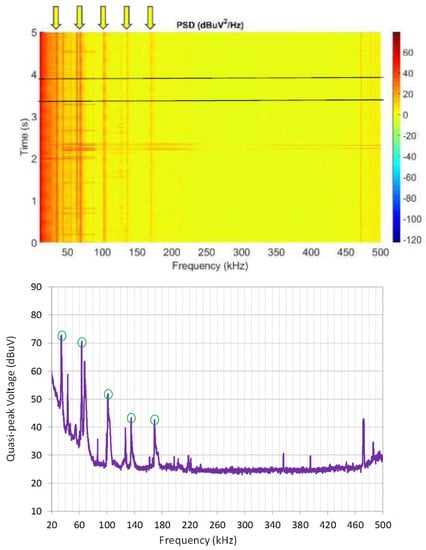 Spectrogram (top) and spectral characterization of NIE according to CISPR 16 (bottom) of a measurement point containing harmonics of 34 kHz (marked with yellow arrows in the spectrogram and with green circles in the CISPR-16 graph).