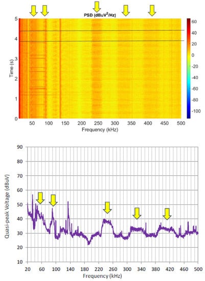 Spectrogram (top) and spectral characterization of NIE according to CISPR 16 (bottom) of a measurement point containing wide band NIE (marked with yellow arrows in the figures).