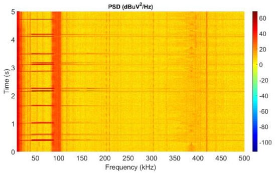 Emissions in the form of colored noise have been also registered in the field measurements. They consist of wide band noise of variable amplitude with frequency. This type of emission may be generated by different types of engines and electronic devices [3,4,15]. Some representative examples of these recordings are shown in Figure 9 (mainly for frequencies up to 200 kHz) and in Figure 10 (with high noise levels for the whole frequency range up to 500 kHz).