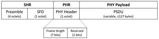 As depicted in Figure 1, OQPSK-DSSS frames are composed of an SHR (Synchronization Header), PHR (PHY Header) and PSDU (PHY Service Data Unit). The SHR contains a preamble and an SFD (Start of Frame Delimiter); the PHR contains the frame length (7 bits) and a reserved bit. Hence, the maximum length of the PSDU is 127 bytes.