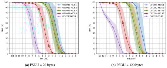 For example, if we consider an interfering signal modulated using OFDM1-MCS1, we can observe that, for a 20 bytes PSDU, the OFDM1-MCS1, OFDM2-MCS2 and OFDM-MCS3 physical layers perform similarly, requiring SIR > 1 dB for PDR > 80%. OFDM4-MCS5 requires SIR > 5 dB to provide a PDR > 80%. In contrast, for a 120 B PSDU, OFDM1-MCS1 requires an SIR > 2 dB, OFDM2-MCS2 and OFDM3-MCS3 require SIR > 4 dB, and OFDM4-MCS5 requires an SIR > 7 dB. Finally, for a 20 byte and 120 byte PSDU, OQPSK-DSSS requires an SIR > 8 dB and an SIR > 12 dB for PDR > 80%, respectively.