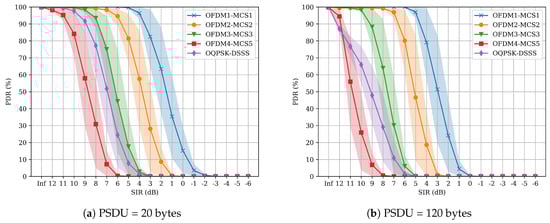 Second, the SIR required for OFDM2-MCS2 and OFDM3-MCS3 is equivalent to OFDM1-MCS1 and OFDM2-MCS2 regardless of packet size (2–4 dB and 5–6 dB, resp.). However, the effect of OFDM3-MCS3 interference causes a 3 dB SIR increase to the OFDM3-MCS3 signal (i.e., 7–8 dB) to maintain PDR > 80%, whereas the OFDM2-MCS2 signal remains unaffected (5–6 dB). Such results can be attributed to the fact that, despite both OFDM2-MCS2 and OFDM3-MCS3 using the same modulation (OQPSK with coding rate ), the former takes advantage of the 2x frequency repetition providing an additional protection of 3 dB. The result is independent of packet length, which confirms the importance of using such protection mechanisms at the physical layer.