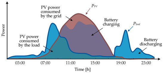 In Figure 2, a typical daily profile of a residential unit with indicated PV generation and load demand during winter month is shown. The profile is characterized by the periods of high PV generation and low load demand in the midday and early afternoon hours. Contrary, low PV power generation and high load demand occur in the evening hours. Due to the misalignment between the PV generation and the load demand, a direct use of self-consumption is limited in the residential PV systems. Thus, the battery storage unit is employed to absorb the excess power during the day and then supply the load in the evening hours. Accordingly, the requested power to be absorbed or delivered by the battery can be defined as: