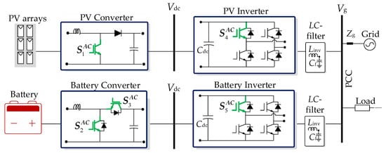 A system diagram of the AC-coupled configuration is shown in Figure 4. Its DC/DC interface configuration is the same as in the case of the DC-coupled configuration. DC/AC interface consists of two units—the PV and the battery inverters.