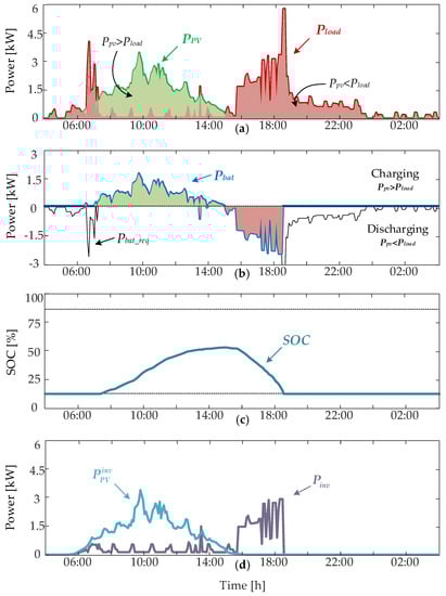 One-day power profile: (a) PV power and load demand ; (b) battery power , where positive power is absorbed power (charging periods) and negative power is delivered power (discharging periods); (c) battery SOC; and (d) input power of inverter of the DC-coupled configuration and PV inverter of the AC-coupled configuration .