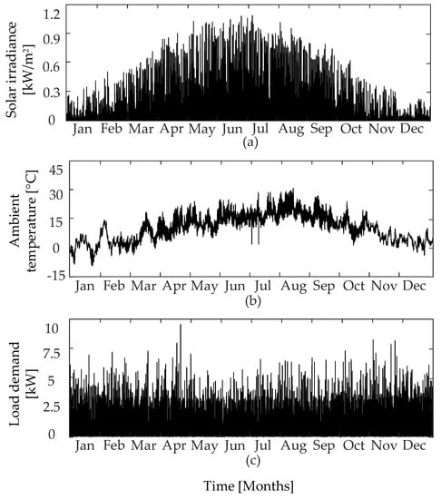A one-year mission profile of the installation site in Germany (sampling rate of 5 min per sample): (a) solar irradiance; (b) ambient temperature; and (c) household load.