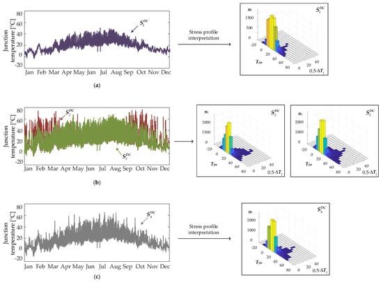 Stress profiles of the power devices are shown in Figure 12. By following the procedure presented in Figure 10, the stress profiles are decomposed to the cycles at different cycle depths and cycle averages, where it is possible to determine the range of and from the thermal stress profile.