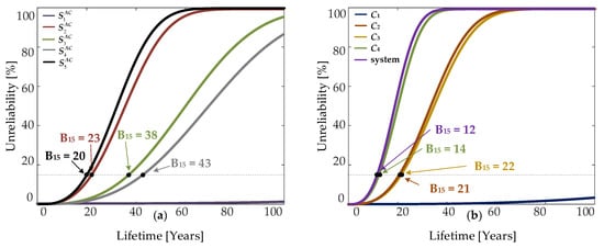The component-level unreliability curves are shown in Figure 17a. The highest unreliability has the IGBT of the battery inverter and its B15 lifetime accounts for 20 years. Similarly, B15 lifetime of the IGBT of the battery converter is 23 years. On the converter-level, the most reliability-critical unit is battery inverter. It means that this unit will develop highest rate of failure over time among all the units of the system. The overall B15 lifetime of the system connected in the AC-coupled configuration is 12 years.