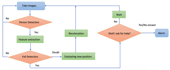 Mobile robots are the right solution for keeping a single person in view when compared to static cameras [14,16,17]. To avoid terrain difficulty, Máthé et al. [18] and Iuga et al. [19] proposed methods that use uncrewed aerial vehicles (UAVs) as mobile robots. A useful aspect of patrol robots, instead of robots that keep the person continuously in view, is the integration of privacy protection and real-time algorithms. As the person is not under supervision all the time, especially in particular locations like the bathroom, the elderly feel more relaxed because their privacy is less invaded.