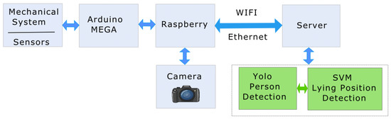 The system is equipped with an Arduino Mega board, various sensors, a single RGB camera and Raspberry V3 B+. We also needed a connection to a server to perform the heavy workload—image processing and the fall detection algorithm. This connection could be WIFI to a remote server or ethernet to a laptop located in the robot. The camera is located 76 cm above the floor and takes images of 640 × 480 pixels (Figure 3).