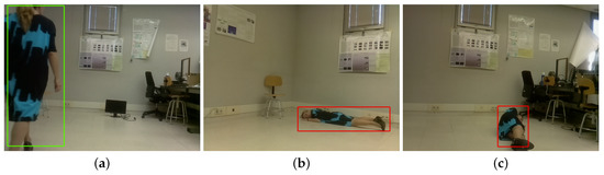 Parameter is the most significant feature that characterizes the fall. As can be seen from the examples in Figure 4a,b, a person standing upright has a small , while this ratio is large in the case of a person lying in a horizontal body orientation position. However, this parameter alone is not enough. There are some cases where the person is in a lying-position but this parameter does not show it; this is the case of lying in a vertical body orientation position, as we show in Figure 4c.