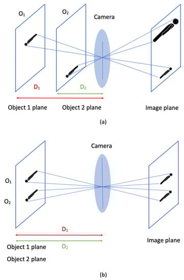 - Objects with the same size at different distances from the camera (object planes) appear with a different size (pixels) in the image plane; the closest one is visible in a larger size (Figure 5a);