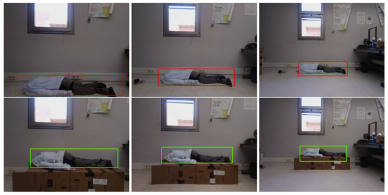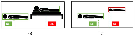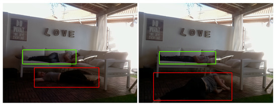 When we compare a fallen person and a resting person at the same distance from the camera, the situation is the one observed in Figure 5b. The resting person is the person in the higher position. As shown in Figure 6a, the and parameters in both cases were the same (same size of bounding box); however, the parameter was different , . For the same value, , the bounding box size for a fallen person should be the red one (see Figure 6b).