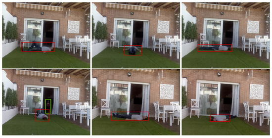 We used Intersection over Union (IoU) as an evaluation metric to compare the bounding boxes provided by the fall detection algorithm and the ground-truth hand-labeled images from our dataset. To set a threshold value for the IoU, called IoU, we analyzed how this value affects the precision and recall parameters. It was observed that the values of these metrics were almost independent of the selected threshold, setting; in that case, value to IoU = 0.2. Values Conf = 0.2 and IoU = 0.2 were also established in Experiment 3.