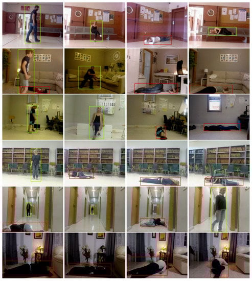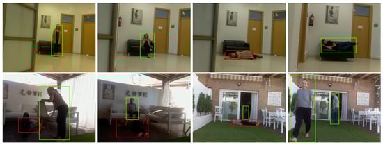 Ground-truth image examples of the FPDS. Each row belongs to a different split. Bounding boxes are red/green in case of fall/nonfall detection.