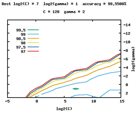 where training data are represented by , , , b is the bias, , are the Lagrange multipliers obtained during the optimization process [43] and , are the support vectors, for which and is a kernel function. A Radial Basis Function (RBF) was used as a kernel in this study: