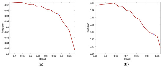 For better optimization, we analyzed whether the correct threshold of the confidence score applied to the rotated images, called conf, was the same as the one used for the image directly from the camera, conf. Figure 13b shows the precision and recall metrics for different thresholds. In this case, we obtained the best trade-off for a value of conf = 0.15, keeping the value of conf = 0.2 for the image directly from the camera.