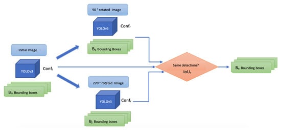 The smallness of the training set represents a significant problem to the overall algorithm, as we analyzed in the previous experiment. Many have, therefore, tried to reduce the need for large training sets. In this article, we investigated how person pose position affects the efficiency of the approach. The experiments show that adding simple pose correction to YOLOv3 improves performance without the need for new customized training. The pose correction algorithm is explained in Figure 14. We ran three separate YOLOv3 networks, one for the initial image and two more for the rotated images at 90 and 270 degrees.