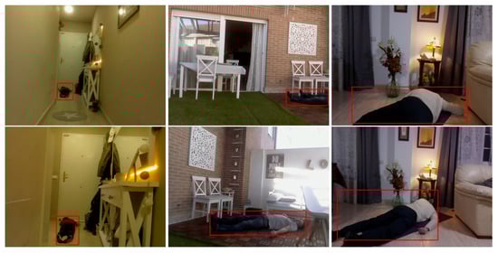 Analysis and comparison of different fall detection algorithms is a real problem due to the lack of public datasets with a large number of people in lying-positions [21,47,48]. ImageNet [28] and MS-COCO [49] are examples of those large image datasets. Some fall detection datasets provide images or videos with the camera situated in different positions but most of them in simulated environments [23,48,50,51,52]. However, they are neither large enough nor have all the required image variations for testing our experiments—several environments, more than one person in each image, persons in resting positions, falls with a variety of body orientations and persons with different sizes and clothes.