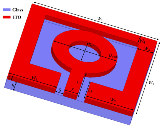 The three-dimensional geometry of the proposed optically transparent antenna is shown in Figure 1. In order to achieve a high transparency, two optically transparent materials, the ITO material and glass, were used as the conductive layer and substrate, respectively. The 1.1-mm-thick easy access glass possessed extremely high transparency (greater than 95%), and its dielectric constant and dissipation factor were 5.5 and 0.001 at the working frequency band, respectively. ITO is a heavily doped n-type semiconductor with a high optical transparency, and it has a bandgap of 4 eV. ITO materials have been widely used in the display industry as transparent electrodes. There is a tradeoff between its optical transparency and the sheet resistance [21]. The optical transparency of ITO thin films is usually approximated by [22]:
