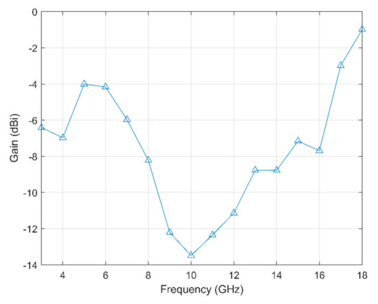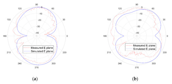 Antenna performance can be investigated in terms of return loss, radiation pattern and gain. Return loss is used to examine the impedance matching, and the measured is shown in Figure 3. Based on this figure, it is noticeable that the measured fractional bandwidths for and are 150% (1 GHz to 7 GHz) and 175.8% (1 GHz to 15.5 GHz), respectively. In addition, the achieved return loss is lower than between 2.5 GHz and 6.5 GHz, which corresponds to a fractional bandwidth of 88.9%, and the return loss of means that only 3% of the total incident power is reflected in the frequency band.