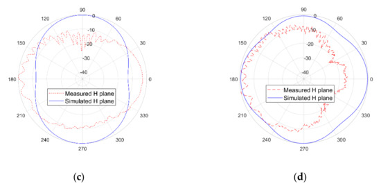 Simulated and measured radiation patterns for (a) the E plane of 5 GHz, (b) E plane of 7 GHz, (c) H plane of 5 GHz, and (d) H plane of 7 GHz.