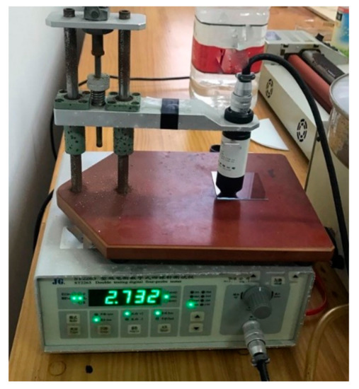 where , and are sheet resistance of each single layer deposited on substrates. A preliminary experiment was carried out to verify the multi-film approach by sputtering copper on an ITO sample through the described sputtering machine. Copper, instead of gold, was applied to decrease the sheet resistance to a greater extent due to its higher electrical conductivity ( S/m). Because of the very short time of copper sputtering, the thickness of copper film was expected to be only a few nanometers, and the transparency of the ITO/copper composite film was slightly reduced. The sheet resistance of composite film was measured by using a digital four-probe tester shown in Figure 6, and it can be seen that the sheet resistance was reduced to . With the copper sputtering, a decrease in device transparency similar to [6] will be found, and a worse transparency is expected if a thicker copper layer is applied for a better sheet resistance. In the next step, the relationship between sputtering conditions and optical transparency/thickness of fabricated films will be studied, and a more precise preparing of multi-layer films will be carried out. The effect of the sheet resistance of the conductive layer on the performance of this antenna was also investigated. As can be seen from the results shown in Figure 7, the antenna gain at 4 GHz can be improved from −8 dBi to 5 dBi when optimizing the sheet resistance from to . At the sheet resistances of and , the obtained antenna gains are −0.2 dBi and −1.2 dBi, respectively. Table 1 presents the corresponding gains at various frequencies for these sheet resistances, which are made up of ITO and copper films with different proportions. We can see from the table that the gain decreases slightly at high frequencies, which is due to worse impedance matching and weak signals, while it is noticeable that the gain becomes better at all frequencies when the film sheet resistance is smaller. As the repeatability and accurate thickness control of multi-layer films are not yet optimized at this point, the comparison and analysis of measured results will be carried out in a deeper level after the optimization of thin film preparation in the near future.