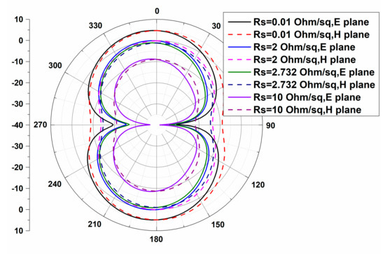 The E plane and H plane radiation patterns of the proposed antenna at 4 GHz when optimizing the sheet resistance of conductive layer.