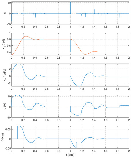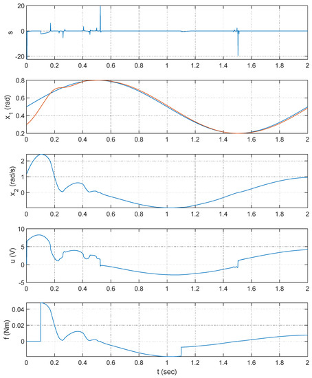 Two simulations were done. In the first one, a square wave reference with different constant throttle angles were used, as shown in the second figure from the top in Figure 2, where the sliding manifold s, the two system states, the control variable u, and the applied fault are displayed from top to bottom. The fault simulated was a function of angular velocity and had a step change at time t = 0.1 sec. Then, the sliding mode variable dropped from zero. Figure 2 shows that, for the rest of the time, even in the presence of the fault, the sliding mode was forced to be zero and was maintained at zero, and therefore the first state or the output converged to the reference output, while the second state, the rotary speed, converged to zero. The dynamics of the states depended on the assigned location of poles. It was also noted that when the friction torque had significant changes, the sliding mode deviated from zero and converged to zero quickly. The output tracking was not significantly affected by the fault due to fault compensation with the RBF network. The control had no chattering due to the integration action.