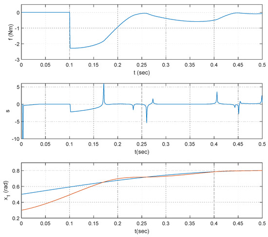 In order to see more clearly the effects of the fault tolerant control on rejecting fault, the part of Figure 3 involving a step change of the fault is enlarged and displayed in Figure 4. Specifically, Figure 4 displays sliding mode variable, s(t), system output tracking the reference signal, x1(t), and fault signal changing with rotary velocity, f(t) from the time period from t = 0 to t = 0.5 s. It can be seen in Figure 4 that when the fault had a sudden change at t = 0.1 sec, the sliding mode variable s(t) was driven to deviate from zero. This caused instability in the system and performance degradation. Due to the action of the fault tolerant control, the sliding mode variable was driven back and converged to zero again, so that the system output was driven to track the reference signal without a significant influence. The adaptive RBF network was used to estimate the change rate of the fault, which was used to compensate for the fault effect in the system state equation. Thus, the post-fault system stability was guaranteed. We could also see when the tracking error changed signs, or when the system output was increased from lower than the reference signal to higher than it (or vice versa), the sliding mode generated a spike. These spikes were quickly reduced, and sliding mode returned to zero due to the control law that was derived with the Lyapunov stability theorem.