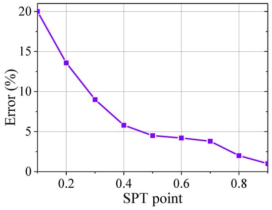 The SPT point is important to rolling bearing RUL prediction. Prediction in normal state will lead to low prediction accuracy, and it is meaningless to predict near failure. Therefore, it is necessary to determine the SPT point to predict the RUL of rolling bearings under certain prediction accuracy. The errors of different SPT point selection under neural network prediction are shown in Figure 2.