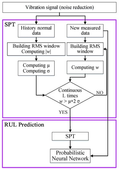 The flowchart of the proposed method for predicting the RUL of rolling element bearings is shown in Figure 4. RUL prediction is divided into two parts—the determination of the SPT point and the prediction. This paper focuses on the determination of the SPT point.