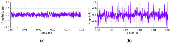 The normal stage sample and degraded stage sample are shown in Figure 5a,b, respectively. To simulate the whole degradation process of the bearing, the signals were repeated 200 times, and Figure 5c shows the vibration signals of the whole lifetime.