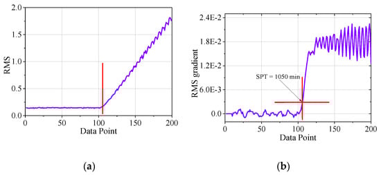 As shown in Figure 6, the method presented in this paper determined the SPT point at the beginning of the degradation. The RMS increased gently at the beginning of the recession, and the RMS gradient increased more than RMS, which indicates that the RMS gradient is more sensitive to the initial degradation stage.