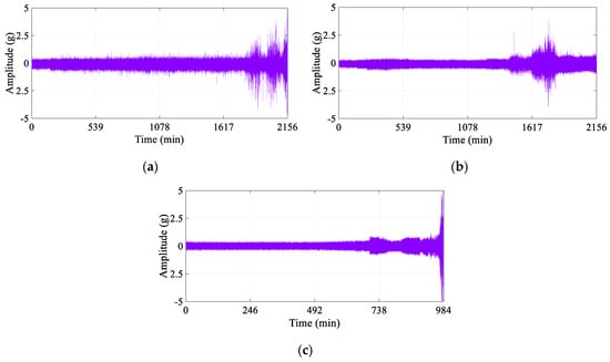 Experimental bearing full life vibration signal: (a) Bearing 1, (b) Bearing 2, and (c) Bearing 3.