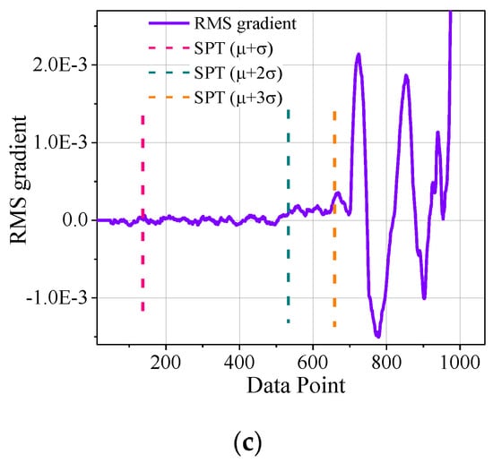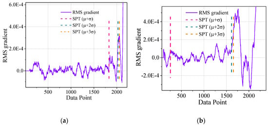 According to Equation (4), the RMS gradient of the normal stage vibration signal is calculated. The SPT under different thresholds (μ + σ, μ + 2σ, and μ + 3σ) were compared. The SPT points at different thresholds are shown in Figure 8.
