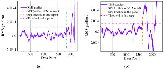The SPT selection method proposed in this paper was compared with the method of W. Ahmad et al. [13]. The RMS gradient was also used as a reference. The results of the SPT determination are shown in Figure 9.