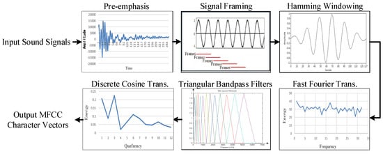 MFCC [9] is a set of parameters commonly used for recording data in sound character extraction [5,6,8,10]. MFCC contains 13 characteristic vectors to identify a voice frame, in which one vector records the voice energy in a logarithmic value and the other 12 mel-scale cepstral coefficients that represent the voice characters. The process to extract an audio frame into MFCC characteristic vectors includes steps of pre-emphasis, signal framing, hamming windowing, fast Fourier transform, triangular bandpass filter, and discrete cosine transform, as illustrated in Figure 1.