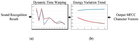 Generally, MFCCs are first used to extract characteristic parameters from the raw data of the audio stream. Next, the extracted characters are compared with a set of prerecorded samples using the popular and effective DTW method [12], as depicted in Figure 2a. For example, Muda et al. [10] devised a voice recognition method that used MFCC and then DTW. The DTW algorithm is an efficient method to measure the similarity between two temporal sequences. DTW was first introduced in 1960s [11]. The algorithm has been applied to voice [13] and image [14] recognition, biometric signature verification [15], and in recent years, data mining analyses for a financial trading system [16] and satellite image time series analyses for earth observation [17].
