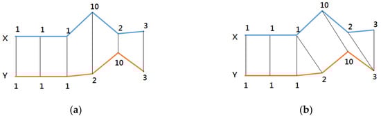 When comparing time series, a major advantage of using DTW as similarity measure is related to the possibility of applying it for sequences of different lengths (i.e., n ≠ m). Accordingly, the DTW distance can be more suitable for measuring the similarity between two similar characteristic vectors, which may slightly vary in the time domain. We provided a simple example of computation for the DTW distance of the matrix elements with two sequences, ‘1,1,1,10,2,3’ and ‘1,1,1,2,10,3’. Figure 3a depicts that the summary of one-on-one element distances is 16 between the two characteristic vectors X and Y, calculated as follows: