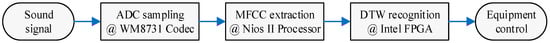 The execution flow of signal processing and sound recognition of the implemented control system is depicted in Figure 4. In the implemented system, a microphone was used to constantly receive sounds and transmit the analog signals to an audio codec using WM8731 [25], which samples the input signal into digital data for further processing. A volume threshold was set (using programming registers of WM8731) in the proposed design to filter low-volume background noise to the processor and allow the system to enter in the sleep mode to save power and then process data on receiving an interrupt signal from WM8731. Next, the MFCC process was executed using a Nios II microprocessor (µP) [19]; in this step, we provide additional designs to refine the performance for nonhuman voices and nonvoice sounds. Last, the DTW algorithm was designed using Verilog HDL and implemented in an Intel FPGA to considerably accelerate the processing speed of characteristic vector comparisons. Finally, the recognition results are used to operate appropriate electric equipment. Detailed introductions for each execution step are provided in the following sections.