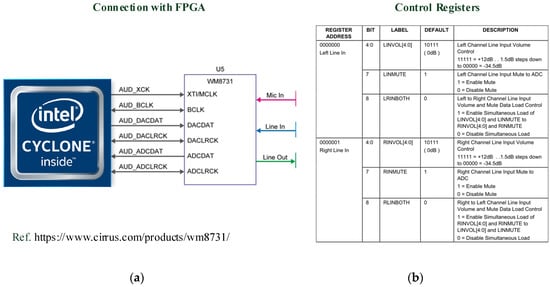 To capture the sound signal, we applied WM8731 [25] as an audio codec connected to the Intel FPGA [18] on the system development board, as illustrated in Figure 5a. The WM8731 codec provides a 24-bit multibit sigma delta analog-to-digital converter (ADC) with oversampling digital interpolation and decimation filters controlled using a two-wire serial interface (i.e., I2C bus), which is used to access registers for functional controls including volume, mute, de-emphasis, and extensive power management, as partially listed in Figure 5b.