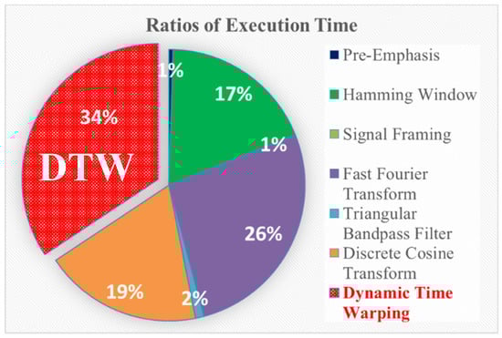The DTW algorithm is easy to implement in software; however, its performance in advanced applications of dense character recognitions is limited because of its computation intensive nature with a time complexity of O (n × m), as discussed in Section 2.4. Figure 6 depicts the ratios of execution time of our implemented system, which reveal that the DTW process accounts for 34% of the execution time (including signal processing and character recognition). Therefore, the execution time should be reduced for rapid recognition results for electric equipment control. Thus, hardware-accelerated DTW processing can be beneficial. Results of a study [15] concur with the paragraph: “Note that the DTW stage is the most consuming element for all three embedded systems, representing more than 96% of the total execution time.”